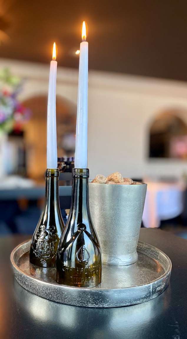 Van de wijn is reeds genoten, de fles is nu aan zijn tweede leven begonnen als een unieke kaars of decoratie die mogelijks gebruikssporen bevat.