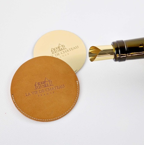 Dropstop in lederen etui. – stijlvol en praktisch accessoire voor het schenken van wijn.