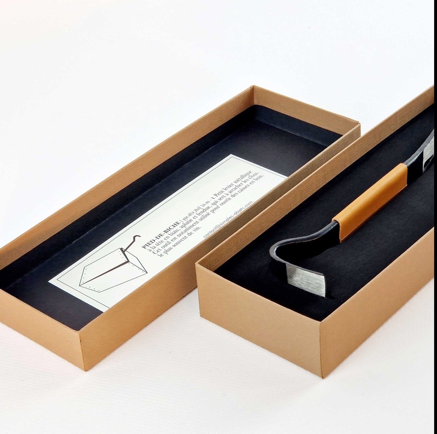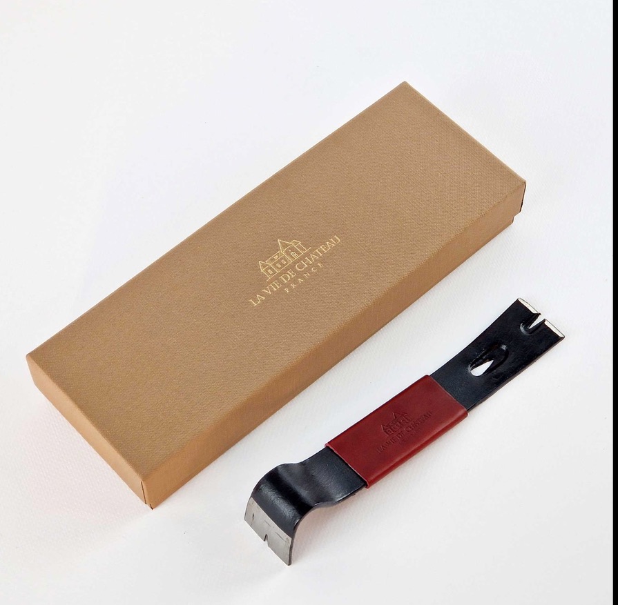 De "Pied de biche" kistopener in een luxedoosje, met handgrip in plantaardig gelooid leder. De Pied de biche is verkrijgbaar in beige, bordeaux en oranje.