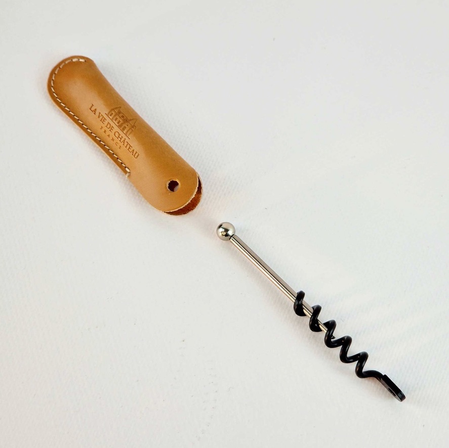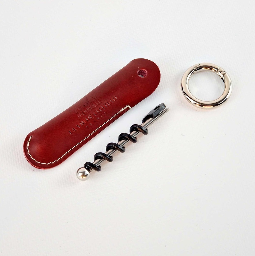 Noodkurkentrekker in een etui van plantaardig gelooid leder, uitgevoerd als sleutelhanger. De sleutelhanger is verkrijgbaar in beige, bordeaux en oranje.